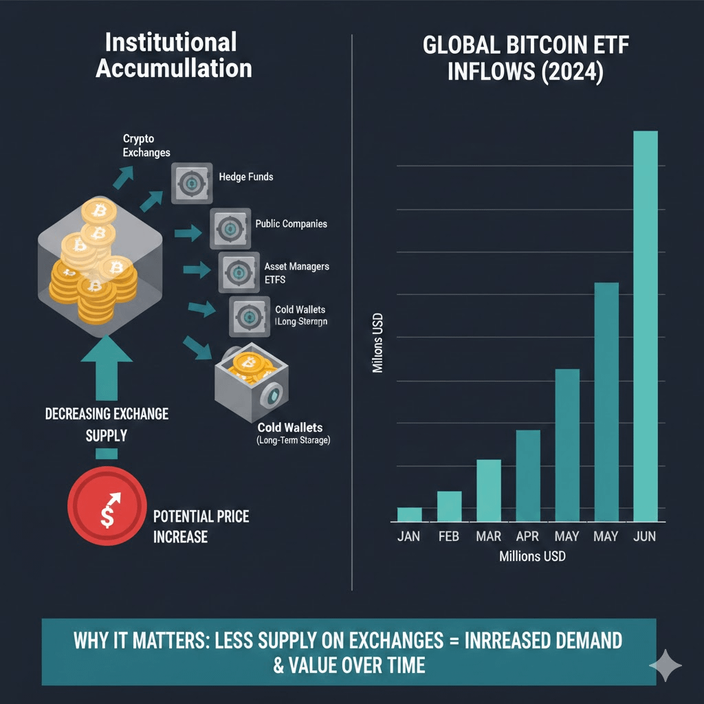 As ETF inflows continue, more Bitcoin is effectively being absorbed into long-term holdings. This reduces the available circulating supply, which can create upward pressure on price if demand remains strong.