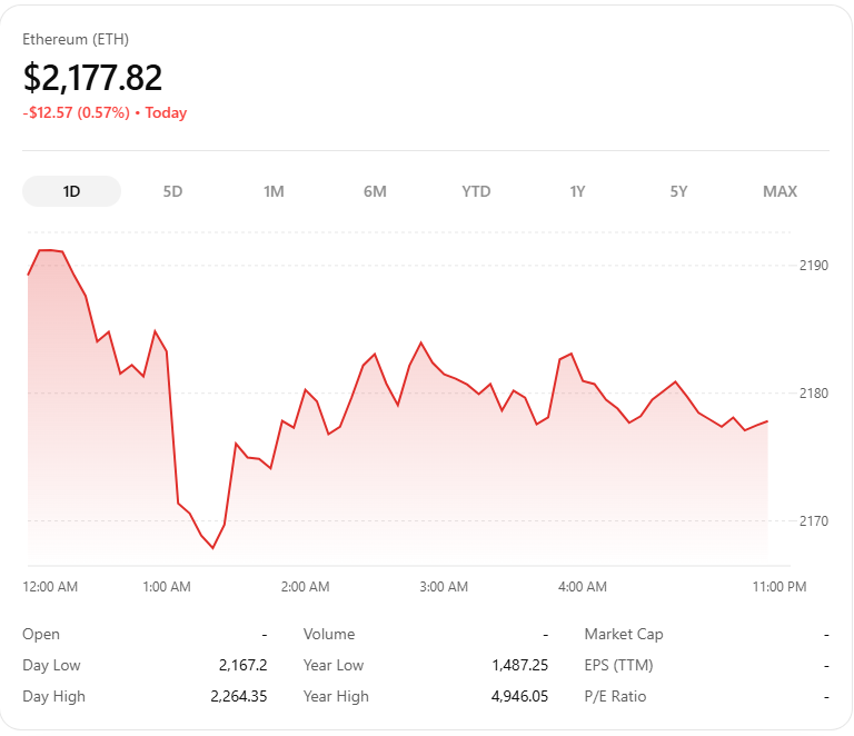 The price of Ethereum is currently going through a phase that many experienced traders recognize well, a temporary correction after a strong upward push. After climbing toward the $2,250 zone earlier this week, ETH has started to pull back and is now stabilizing around the $2,100 to $2,200 range.
